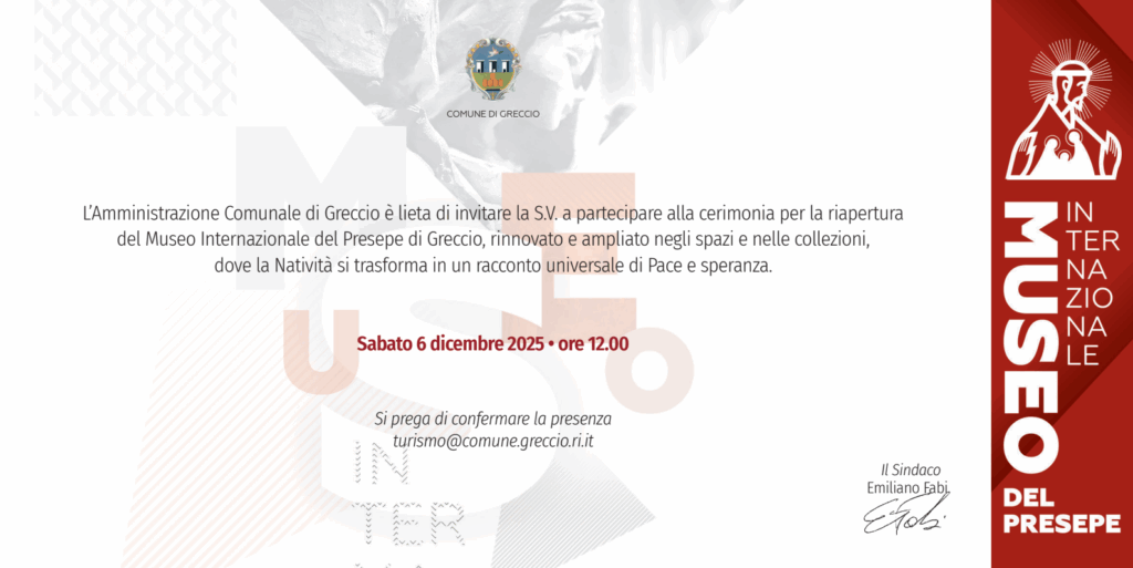 L’Amministrazione Comunale di Greccio è lieta di annunciare la riapertura del Museo Internazionale del Presepe, un luogo simbolo della tradizione francescana e del messaggio universale di Greccio, culla del primo presepe al mondo.